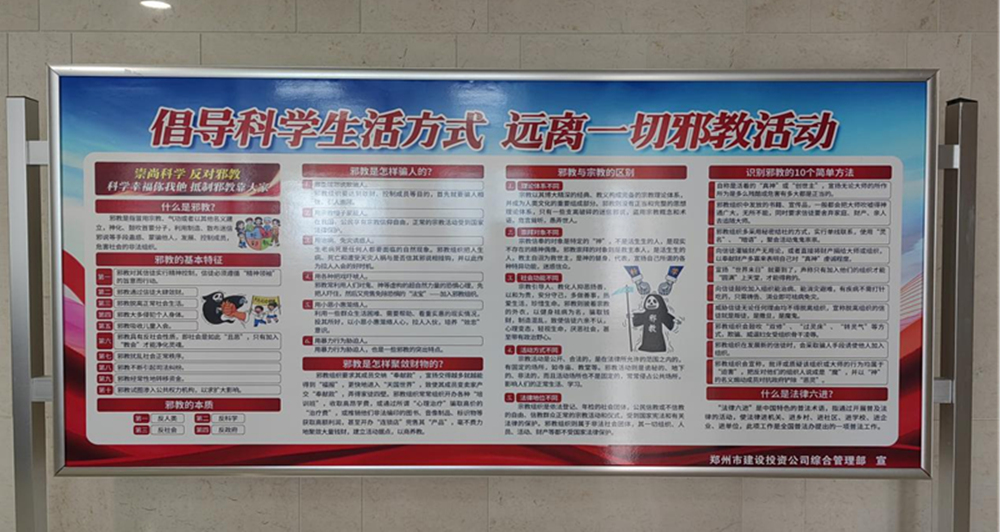二是以点带面,增强意识。集中开展了反邪教知识、案例展示宣传活动。利用宣传展板、悬挂横幅、电子屏持续对外播放宣传标语,并以反邪教知识、邪教案例、法制宣传等为主要内容制作了10余块宣传展板。